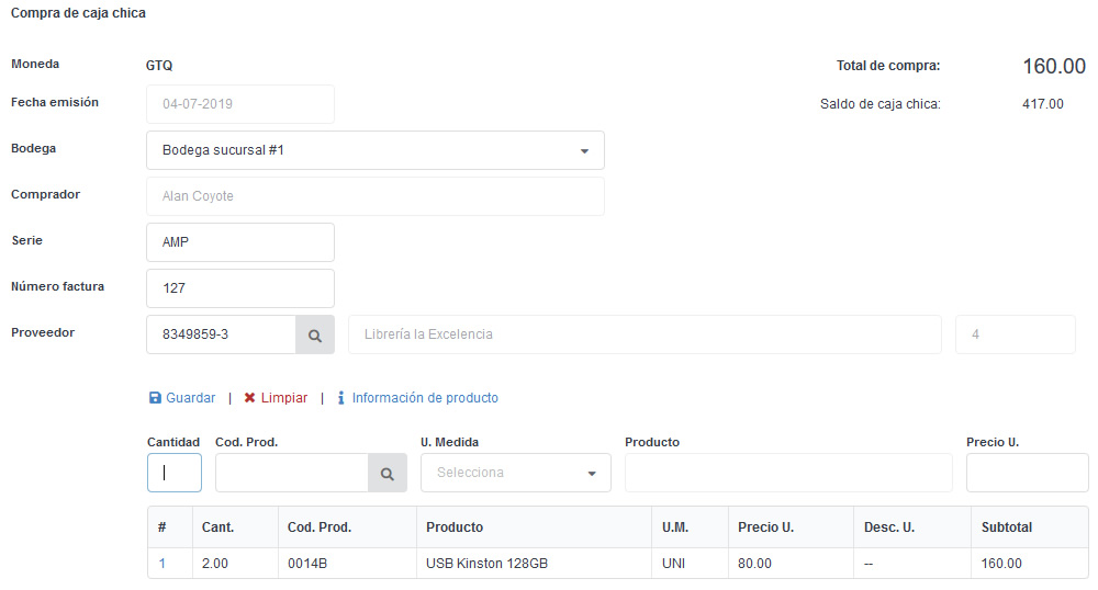 Registra las compras con un control caja chica y saldos de cada una de ellas. Carga al inventario a la bodega que corresponde de forma inmediata cuando la compra es de un bien.