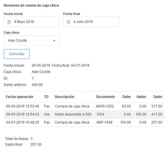 Consulta el resumen de cuenta de cada caja chica para conocer los movimientos de ingreso y egreso realizados en las fechas seleccionadas.