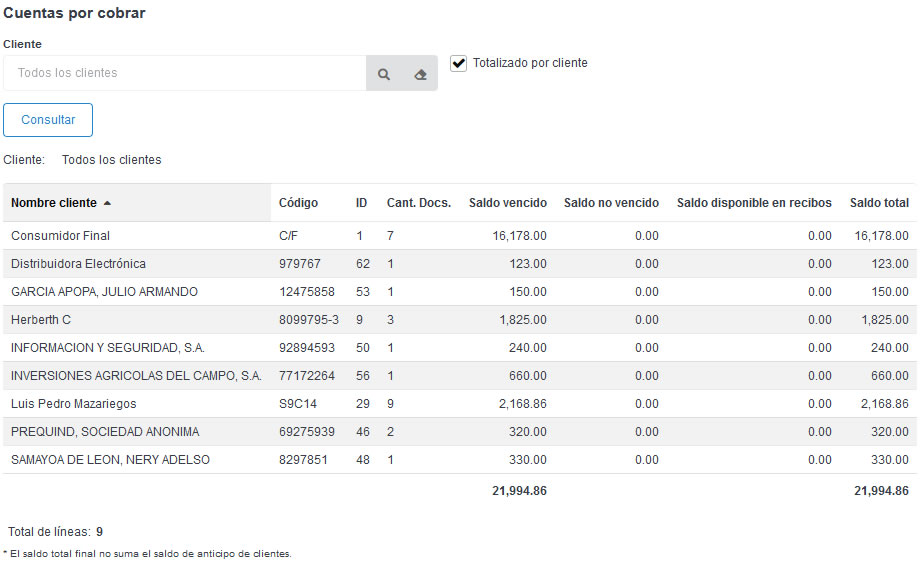 Consulta tus cuentas por cobrar de todos tus clientes en una vista resumida o con detalle de documentos.