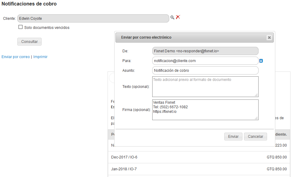 Envía las notificaciones de cobro a tus clientes por correo electrónico de forma individual o masiva.