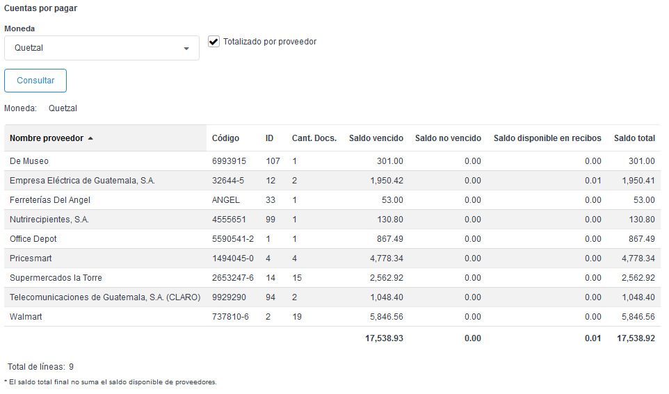 Consulta tus cuentas por pagar a todos tus proveedores en una vista totalizada o con detalle de documentos.