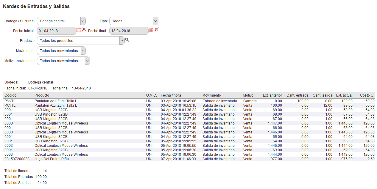 Consulta el kardex de tu inventario, sus movimientos de entrada y salida por bodega a la vez con su costo unitario según el método de valuación establecido.