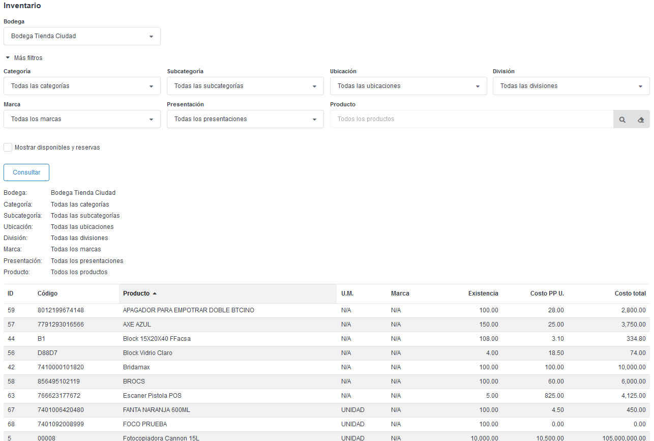 Lista todos los productos pertenecientes a una bodega o tienda, sus existencias en tiempo real, costo unitario y total.