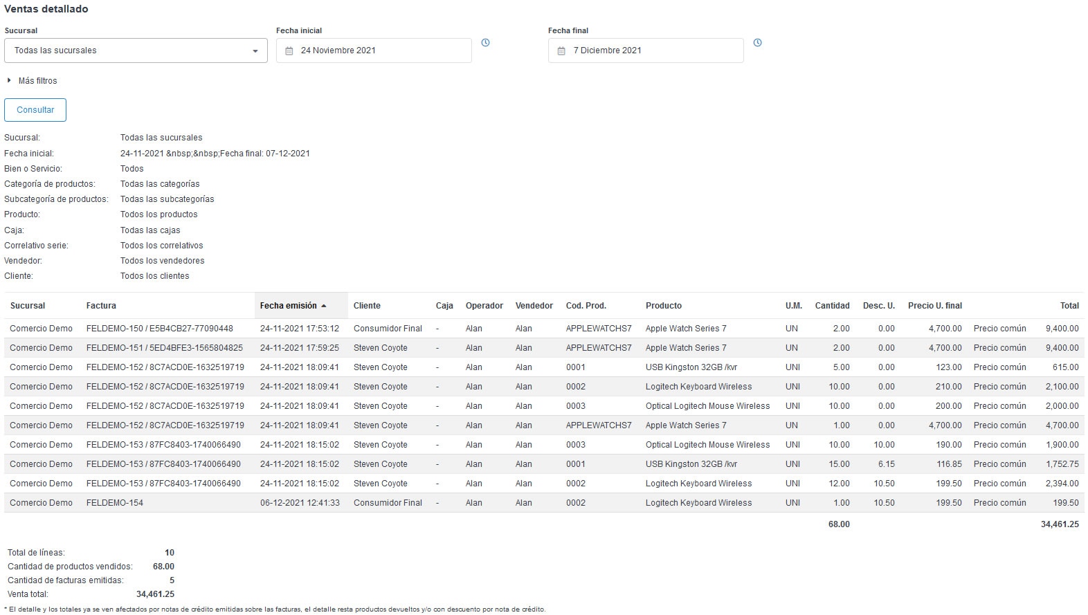 Conoce el estado de tu negocio a través de una amplia gama de reportes como: ventas detallado por cliente, producto, fechas, sucursal o vendedores, venta de productos totalizados ordenado por el más vendido o más generador de utilidad, listado de facturas, cierres de caja, notas de crédito/ débito y más.
